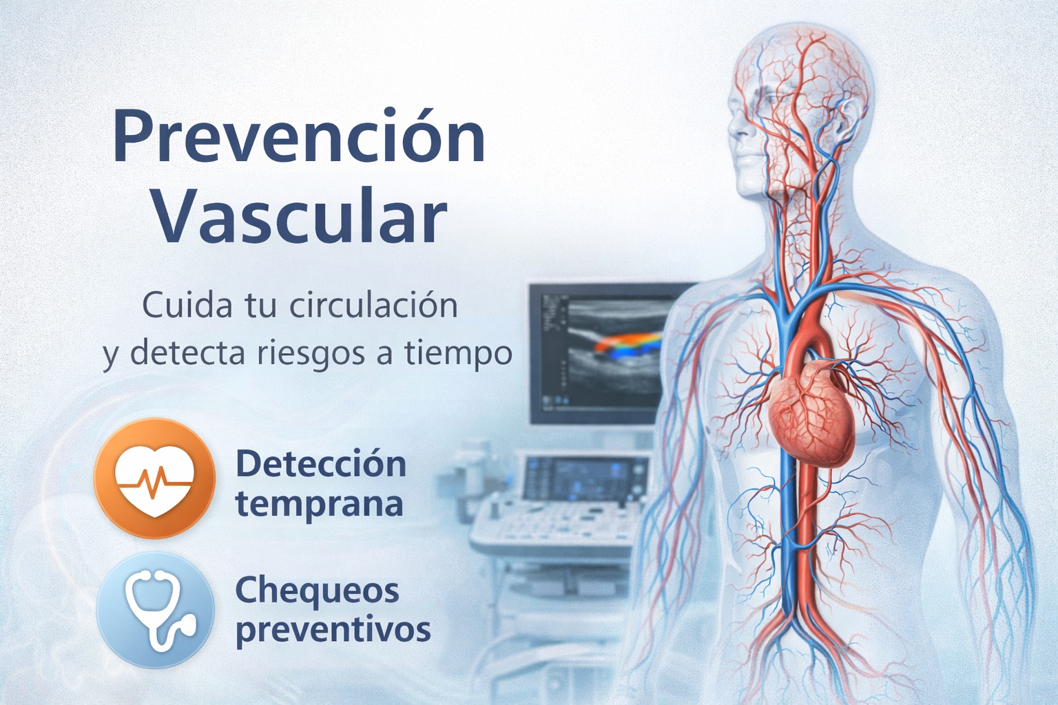 La salud vascular (arterias y venas) influye directamente en el funcionamiento del corazón, el cerebro y las piernas. En muchos casos, los cambios vasculares progresan de forma silenciosa durante años. Por eso, la prevención vascular se basa en dos pilares: identificar factores de riesgo y valorar la circulación con pruebas no invasivas cuando está indicado.